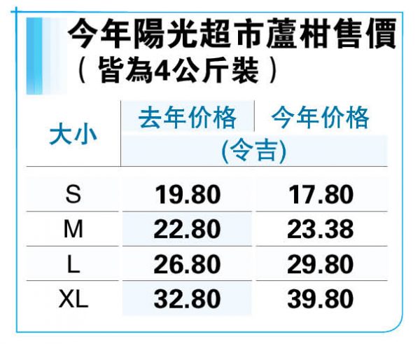 (槟城30日讯)阳光零售连锁集团董事余锦明说,今年的特大、大、中粒中国芦柑因产量减少导致价格比往年增20至25%,而小粒果价格则比去年便宜15%。