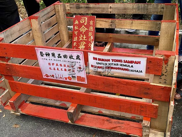 他指出,民众可将神牌、神明金身、香炉、金花红球等祭神用品,送往以上回收处回收,这些物品收集后,将会在宗教人士诵经等宗教仪式后焚化处理。