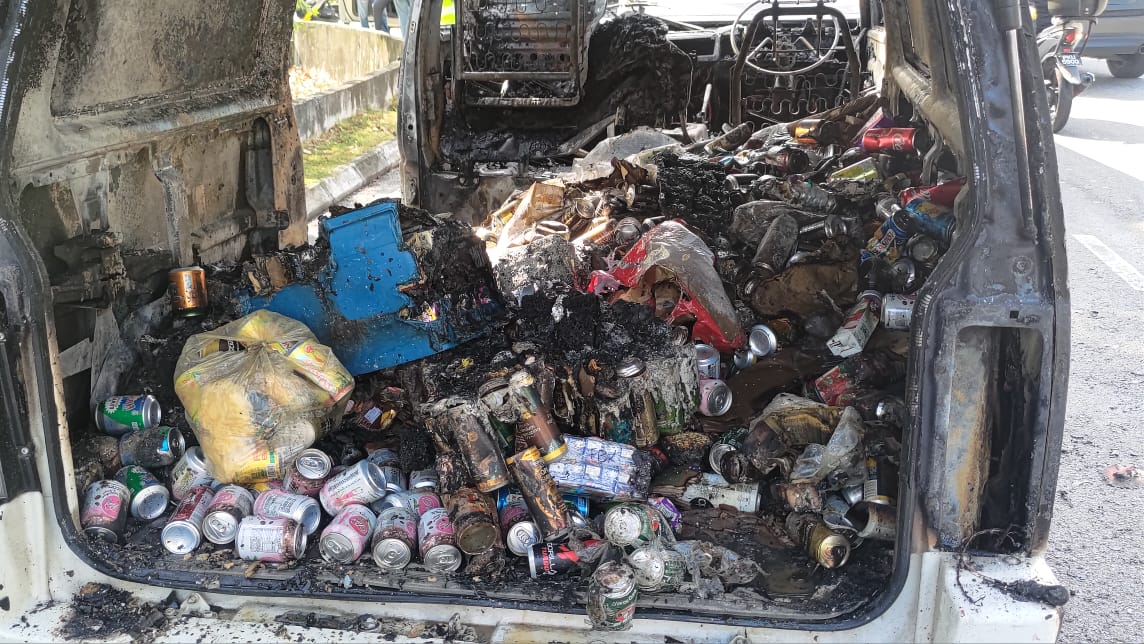 (槟城27日讯)载满各类罐装饮料的货车在路上突然起火,司机赶紧停车路旁,保住一命。