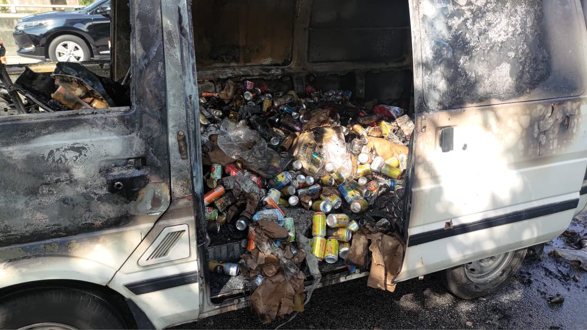 车内的饮料罐全都毁于一旦,业者损失惨重。