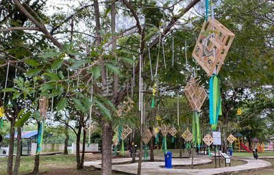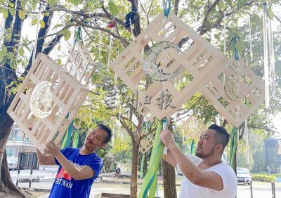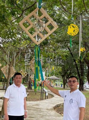 (北海6日讯)随着开斋节即将来临,北赖金沙园休闲公园开始换上新装,这回是挂满以木条设计而成的葵叶粽(Ketupah)及星月灯饰,展现各族不分彼此喜迎佳节的和谐氛围。