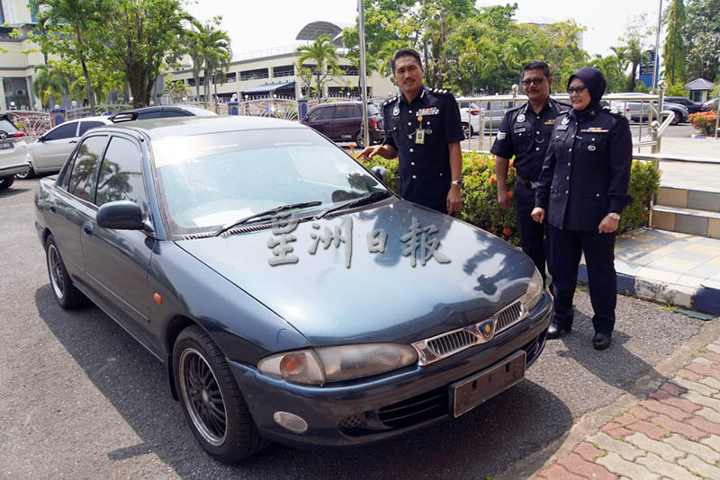 尤沙里夫丁(左起)、查案官武佰迪拉沙及加央副警区主任芭依雅向媒体讲解劫匪用来作案的轿车。(张洁盈摄)