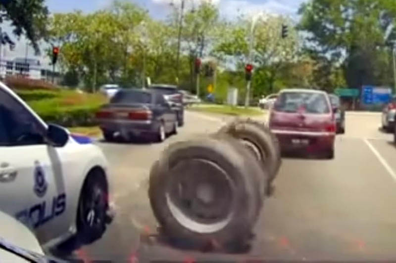 (双溪大年5日讯)警车在路口等待红灯转绿,竟遭一个滚来的卡车车架和轮胎击中!