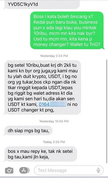 神秘人索讨1万令吉的虚拟货币(折合成美元),还提供中间人联络号码,要车行业者用电子钱包过账给中间人,该中间人就会兑换虚拟货币给神秘人。