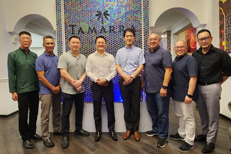 杨顺兴(左四起)及日下部稔,与槟城旅游业者会面商讨有关槟城与日本开拓新航线的可行性。左一起为吴乃庆、苏海利、庄学腾,右起为黄茁原、吴家栋、邱武林。(杨顺兴办公室提供)