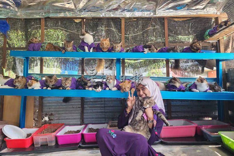 槟城一名马来女工程师不忍流浪猫受伤挨饿,独自照顾从街上救回家里的61只猫咪。把猫咪视如家人的她,除了替所有猫咪取名赋予它们身分外,今年开斋节她还特地为它们穿上与自己相同颜色的服装。