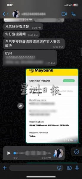 这名“美女”趁男子发送不雅视频后马上亮出男子身份,开口勒索2800令吉,否则传至其亲朋好友圈内,受骗者心慌下照办。不料,对方继续狮子大开口,再向受骗者勒索1万令吉,受骗者害怕之余再汇款1000令吉,并承诺设法找钱。