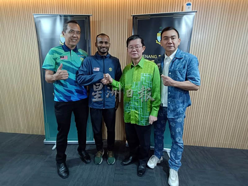 曹观友(右二)希望克里斯托弗(左二)在这次的世界田径路跑锦标赛竭尽全力,为马来西亚及槟城争光;左起林子辉及邱继勇。(黄雨云摄)