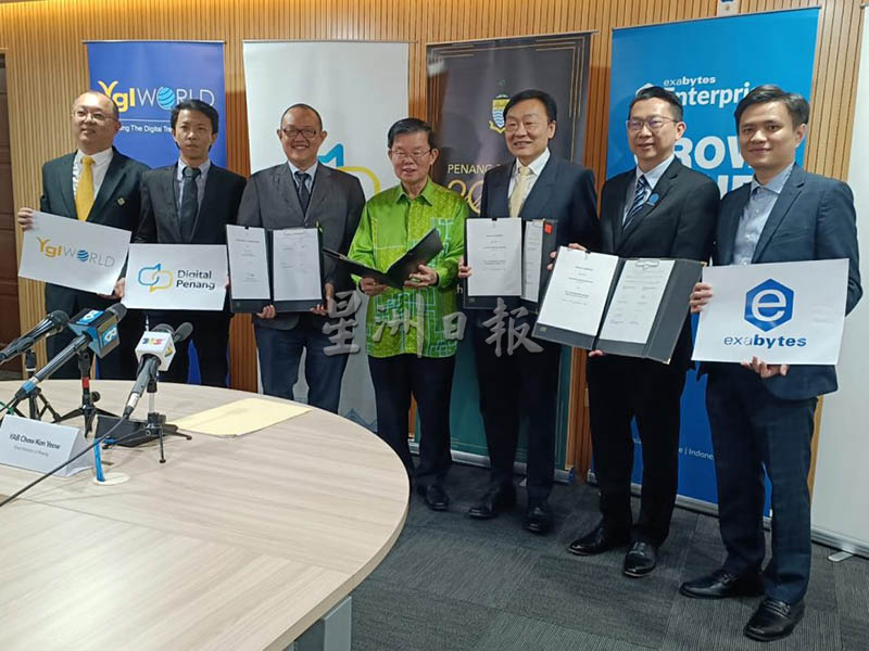 他今日在光大53楼见证槟州数字机构与威力行集团(Ygl Convergence Berhad)签署谅解备忘录,并同时见证Exabytes集团与威力行集团签署合作协议。
