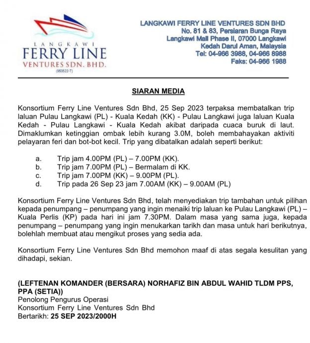 Ferry Line Ventures客船公司助理经理诺哈菲说,取消的包括25日下午4时和晚上7时从浮罗交怡至吉打港口的班次、周一晚上7时从吉打港口至浮罗交怡的班次,以及26日早上7时从吉打港口至浮罗交怡的班次。