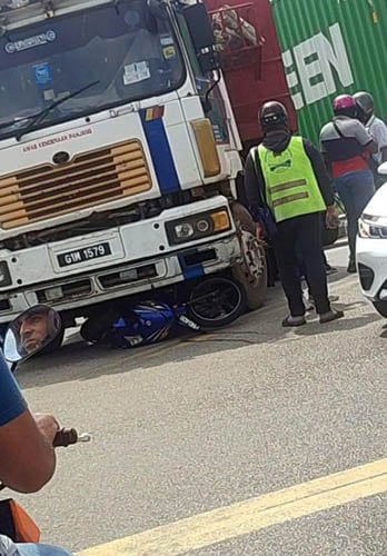 (双溪大年6日讯)摩托车在交通灯前的转弯视线盲区与罗里发生擦撞,19岁骑士连人带车摔跌路上,复遭罗里碾过头部,当场毙命。