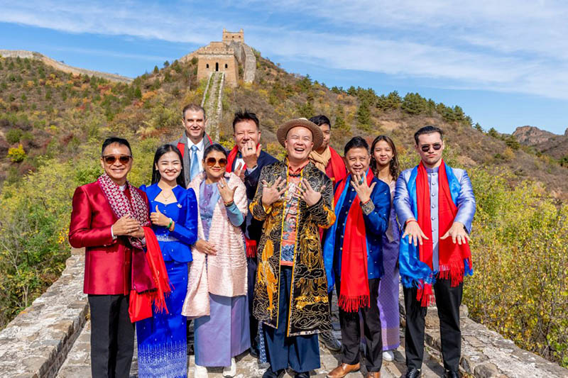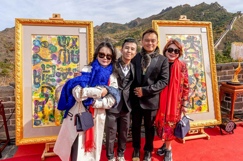 云大师与柬埔寨王室成员及赞助人,一起在长城上展示云龙子旺财馆独创的翡翠戒指。(图:长城风水书法展)