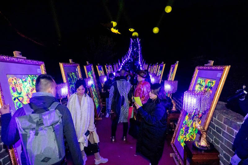 入夜的长城亮起了风水书法的夜光色彩,这又是一道长城前所未有的风景。(图:长城风水书法展)