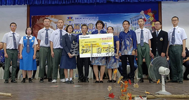 仪式上,毕业生献金3840令吉回馈给母校,由校长廖雪萍接领,3名副校长何慧文、黄明强及苏培新见证。