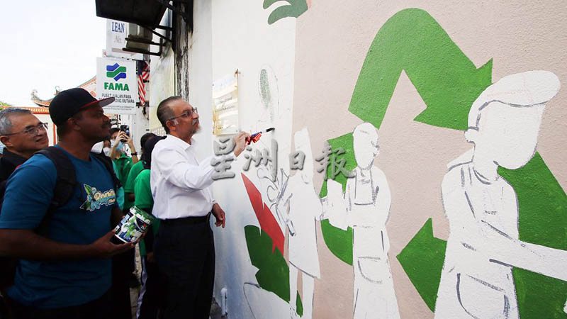槟州第二副首长佳日星今日在槟岛批发市场(社尾万山),为一幅以呼吁民众减少食物浪费为主题的壁画主持推介时,赞赏这项蔬菜回收方式非常有意义,通过各造的联手合作,收集即将被丢弃的新鲜蔬菜和其他食品再送达给有需求的民众。