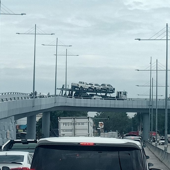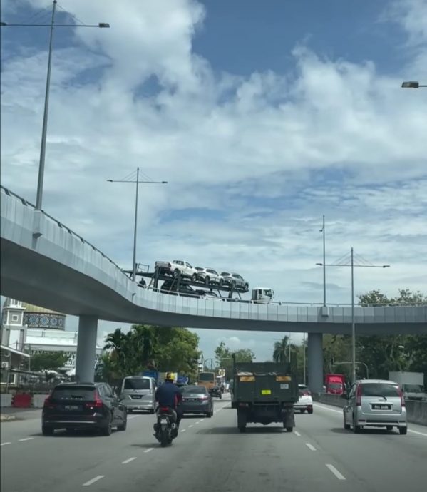 (槟城9日讯)疑似外州司机不熟槟岛路况,一辆载送汽车的重型罗里,今午在转弯时卡在高架公路上。