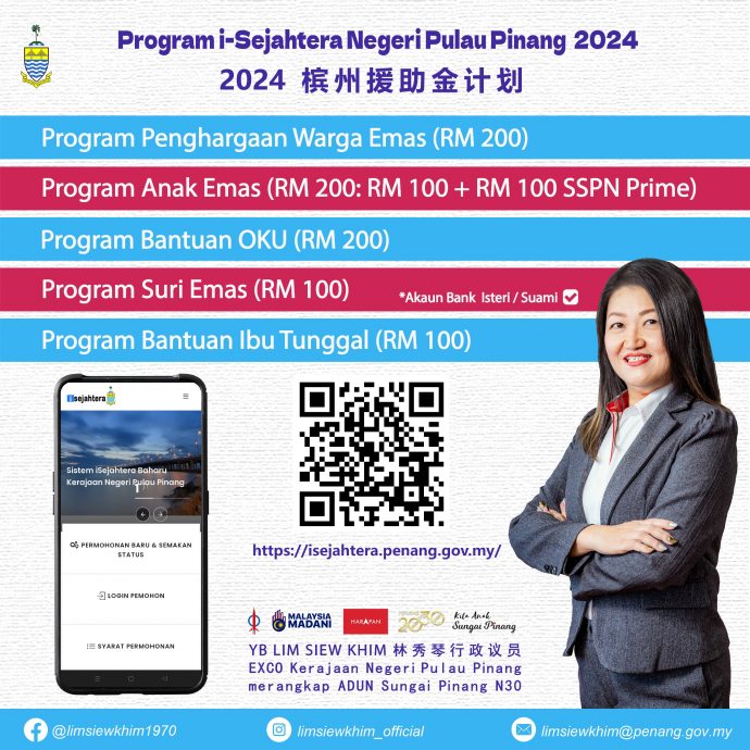 林秀琴呼吁乐龄人士回馈金、单亲妈妈援助金、黄金妈妈援助金和残障人士援助金的受惠者(无论是现有的还是新申请者),更新并确保银行户头处于活跃的状态,以便顺利获得i-Sejahtera计划的援助金。