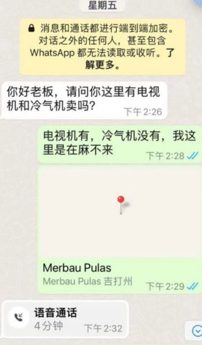 麻不来一家电器店业者邓先生受询时指出,他昨午接获来一名男子的Whatsapp信息,表示要购买3架70寸电视机,并要求送往打活公民华小,间中还讨价还价,似乎很有诚意要购买。