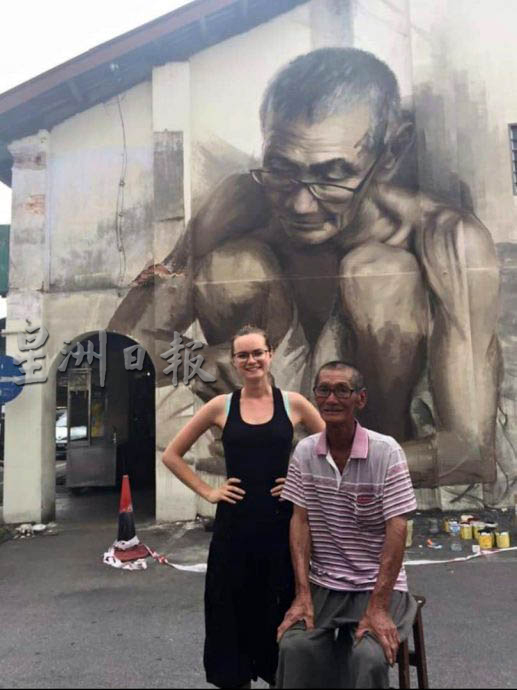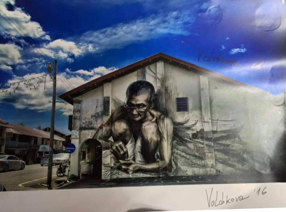 不久之后,附近小山城浮罗山背的朋友告知,他成为浮罗大街停车场旁一幅占了整个屋子侧面墙壁的大壁画主角。