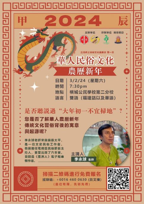 (槟城19日讯)三清慈爱福利会与One To Tree希望基金联谊会将于2月3日(星期六)晚上7时30分,在公民学校第二分校举办“三清杯”之回温系列第一章“华人民俗文化·农历新年”讲座,邀请我国著名文化民俗历史田野工作者李永球主讲华人农历新年传统文化习俗寓意及起源。