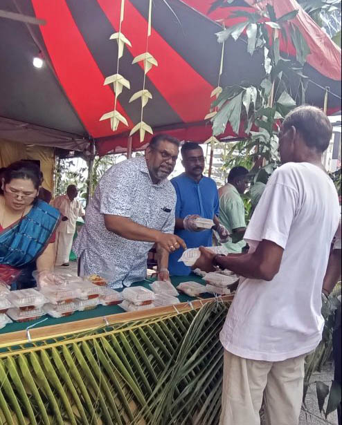 在帐篷周围,信徒有序排队,耐心等待领餐及享用由双威酒店团队精心准备的大餐,包括米饭、马铃薯、南瓜和各种调味料。穿着传统服饰的酒店工作人员愉快地为宾客服务。