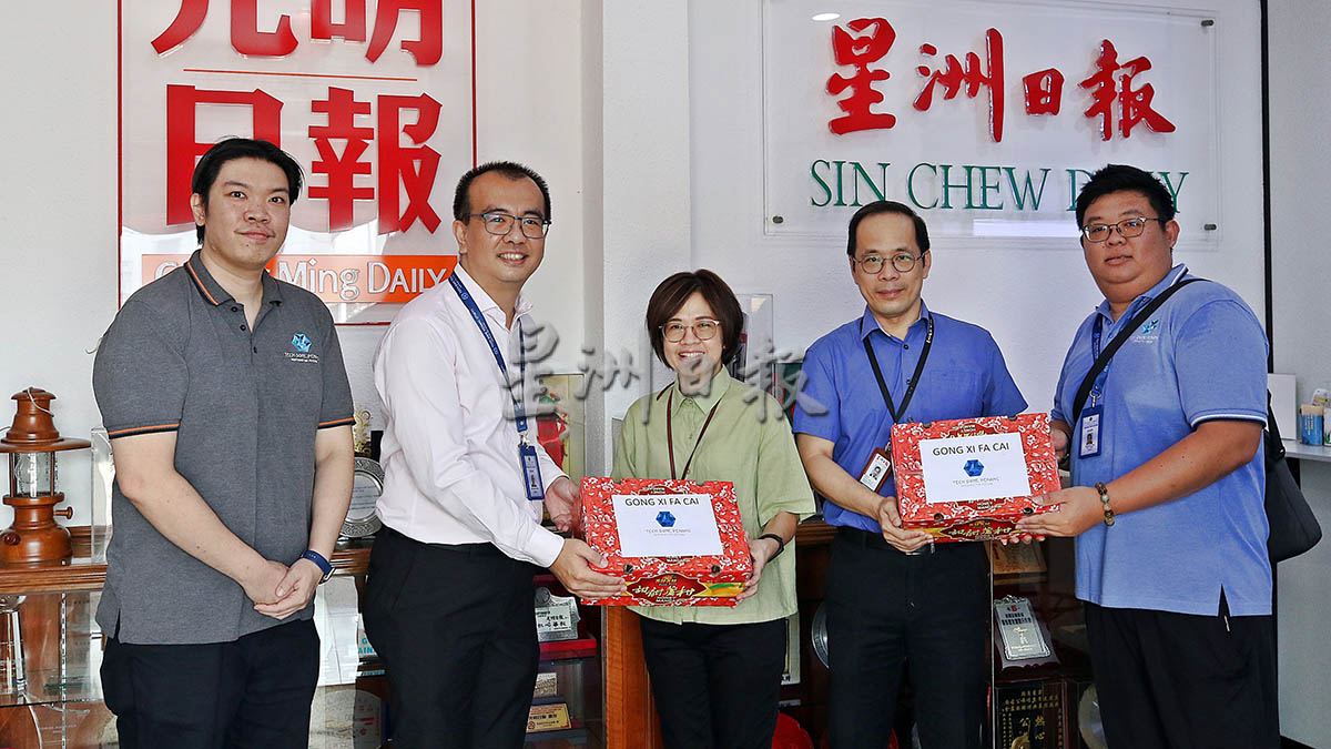 槟城圆顶科学馆(Tech Dome Penang)高级教育顾问龚威杨(左一起)、首席执行员邱武威及高级维修执行员杜永升(右一),到访星洲日报槟城办事处与光明日报总社,祝贺两报同仁和读者龙年行大运,获星洲日报北马区高级采访主任蔡振裕(右二起)、光明日报新闻主任周秀惠接待。(林晓慧摄)