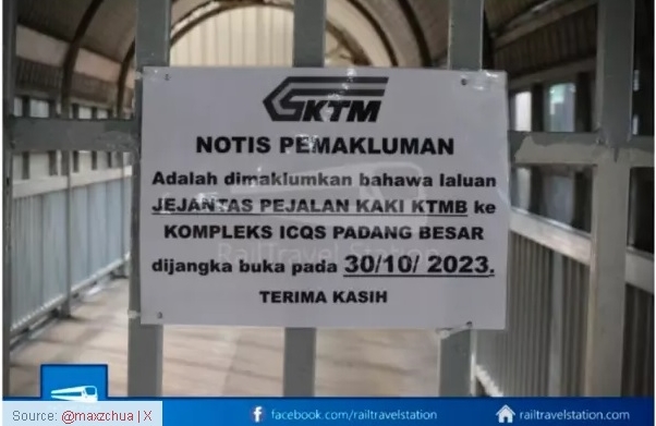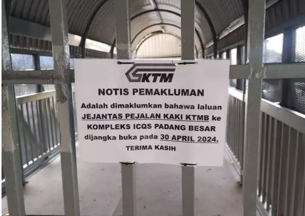 (加央2日讯)巴东勿刹火车站通往移民、关税及检疫(ICQS)大厦的行人天桥自从2020年关闭至今,重新开放日遥遥无期,网民在X平台上载马来亚铁道公司(KTM)在行人天桥闸门通知开放日期的照片,从去年10月至今已展延5次,最新通告阐明今年4月30日重开。
