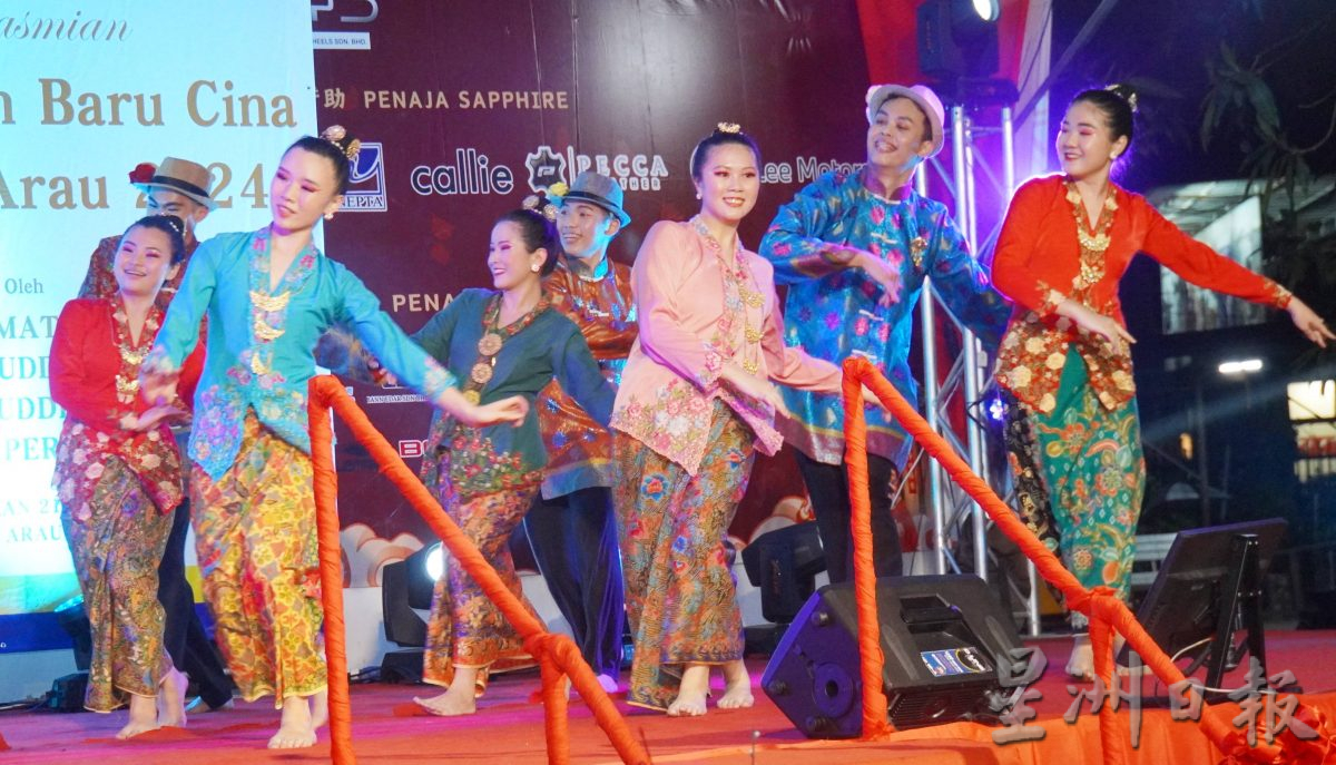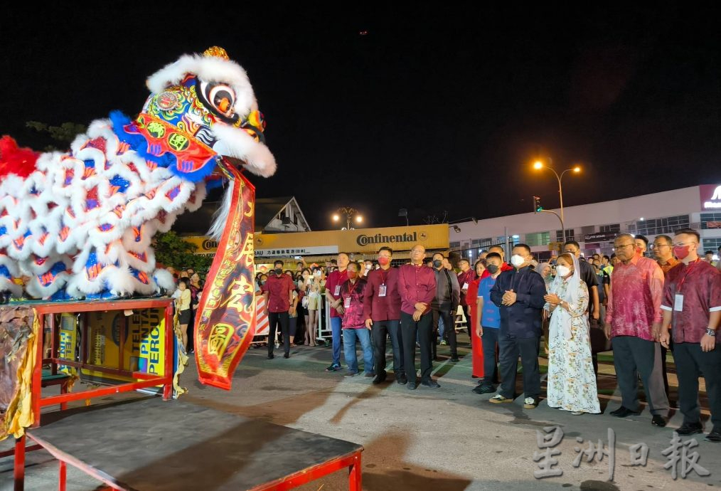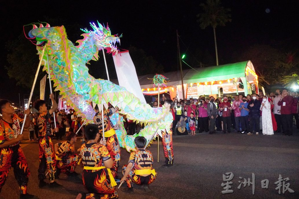 是夜,主办单位邀请吉打巫家班冠胜龙狮团来演出,由传统南狮掀开序幕,再由纯粹舞团表演灯笼舞、峇峇娘惹舞蹈,玻中总理事黄诗咏及黄欣平也高歌一曲,之后LED“祥龙”在开幕礼后也带领众嘉宾逛年街,场面热闹。