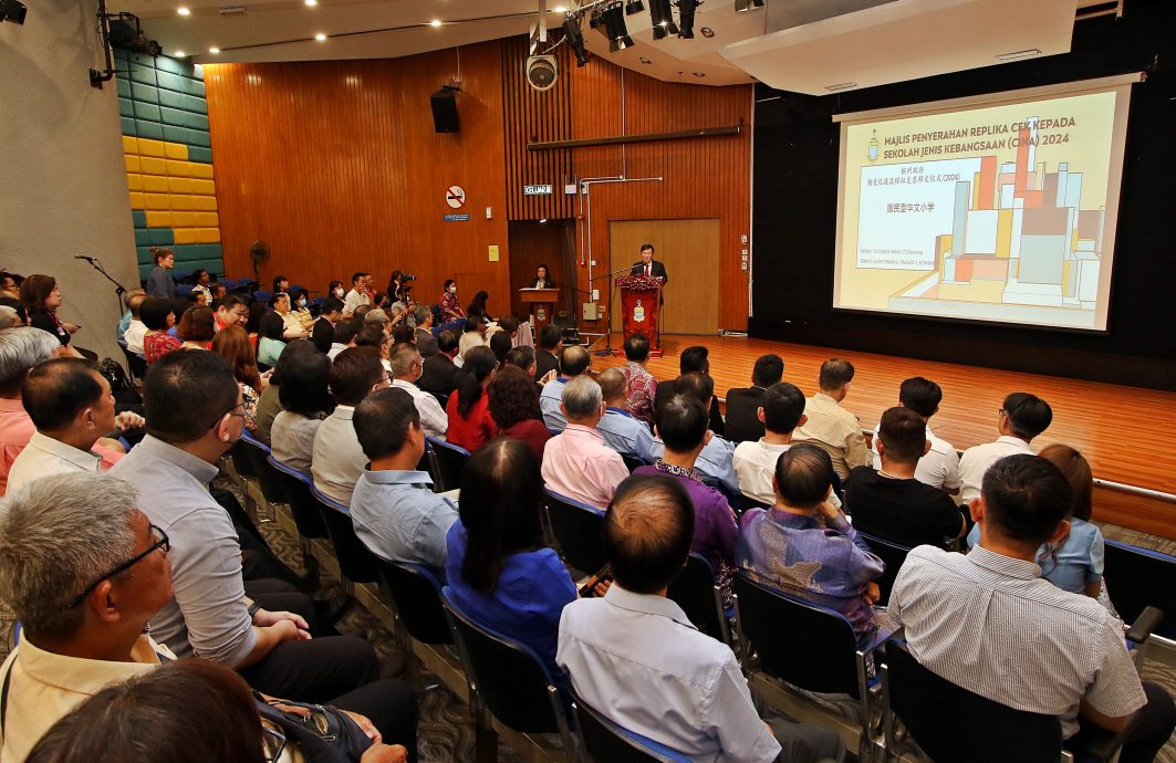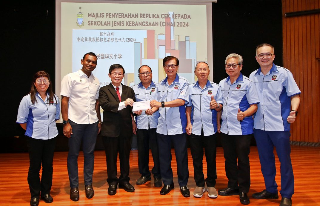 槟州首席部长兼槟州政府华校及教会学校事务协调委员会主席曹观友,今午在各州选区议员的陪同下,在光大视听室移交2024年制度化教育拨款的模型支票给84所学校,由各校代表领取。