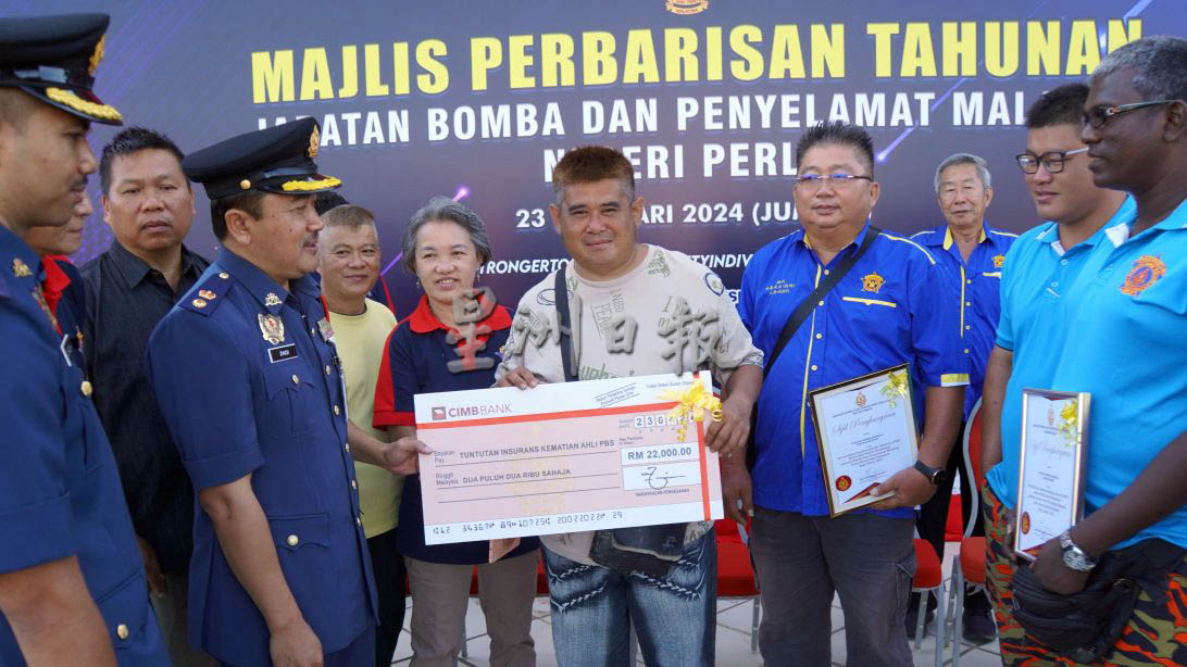 另外,玻璃市港口义消队已故队员杨志强去年因呼吸困难入院,抢救不及逝世,消拯局移交抚恤金2万2000令吉给家属,由儿子杨雄伟(35岁)接领。