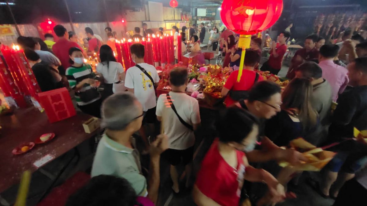 (西岭5日讯)西岭财神爷庙遇火劫后的开库日前夕人潮依旧,由于临时神坛比原庙址宽敞,造成理事会也难以估算人潮。