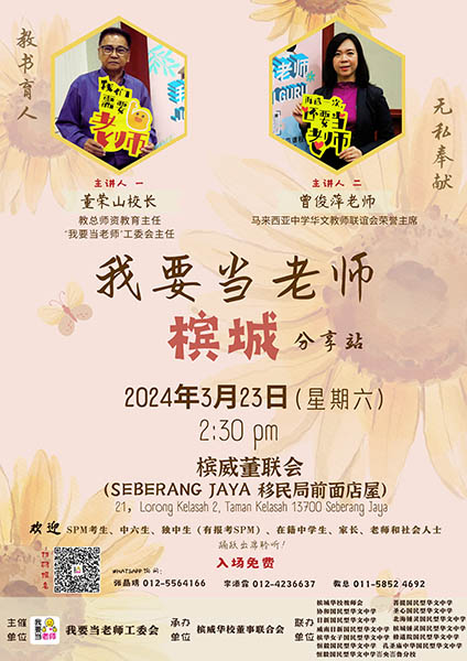 23日办“我要当老师”说明会 地点:槟威董联会会议厅