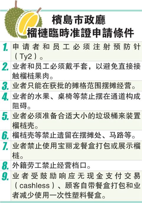 槟岛市政厅:须符合9条件 可申请准证 摆摊卖榴梿