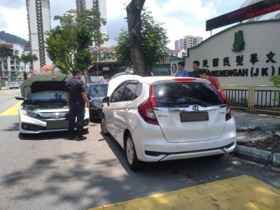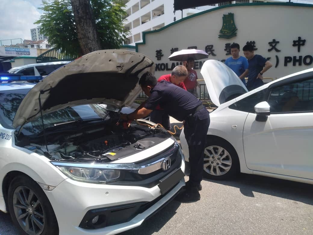 (槟城29日讯)一家四口共车外出,路上因电瓶耗完电而停车,大家正烦恼之际,幸好遇上好心的警察。警察通过警车的电瓶,搭电让对方的车子蓄电。