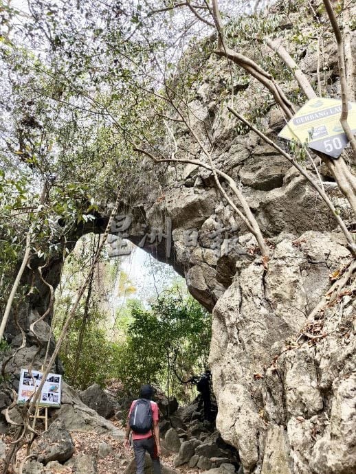 (加央29日讯)玻璃市大自然探险家组织(PNX)于3年前,在加央柏希哈吉山(Bukit Besi Hangit)发现一座7公尺高的天然拱门(natural arch),初步推算是自全新世纪年(Holocene Era)即约公元前2万至7000年,面对海水侵蚀及风化影响所形成。
