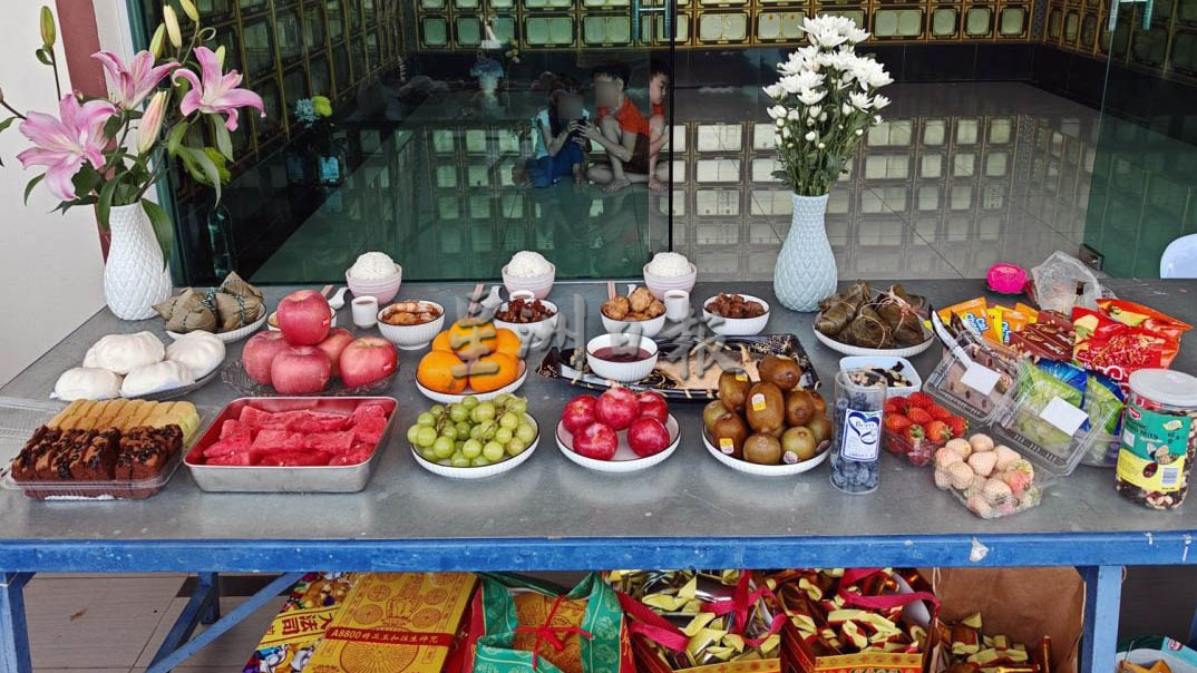 庄群施生前最爱吃酸辣的食物,她的家人今天特地准备了大虾东炎、草莓、奇异果,还有她最爱的花束–粉色百合拜祭她。