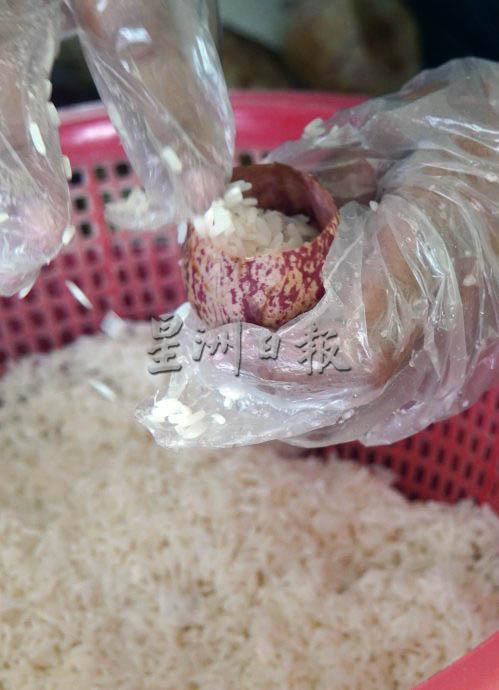 “第二个步骤,就是把洗净的纯正白糯米(pulut susu)装入猪笼草,只需七分满,因为我们还要倒入椰浆,如果太满,椰浆就会溢出。”