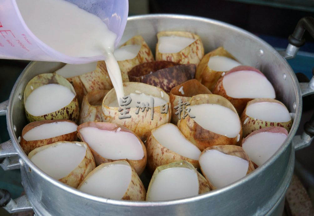 “待蒸锅的热水煮沸后,我们再放入猪笼草糯米,然后就慢慢倒满加了盐的椰浆,当蒸熟后的猪笼草糯米饭,会有一层浓椰浆覆盖,我们俗称‘椰浆头’(kepala santan),因为我们只加少许的水搅拌椰浆,蒸熟后才会留下这一层‘椰浆头’。”