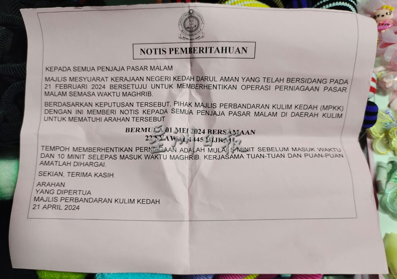 吉打州多个地方政府前后发布通告,宣布穆斯林夜市摊贩于5月1日起在昏礼(Solat Magrib)时段暂停交易。此措施是随着吉打州行政议会办事处(MMK)于今年2月21日商讨后决定,州内所有穆斯林为主,即不管是政府管辖,或私人界经营的夜市,须在昏礼时段暂停交易约20分钟,旨在让穆斯林小贩、员工及访客在昏礼时段履行祈祷义务。