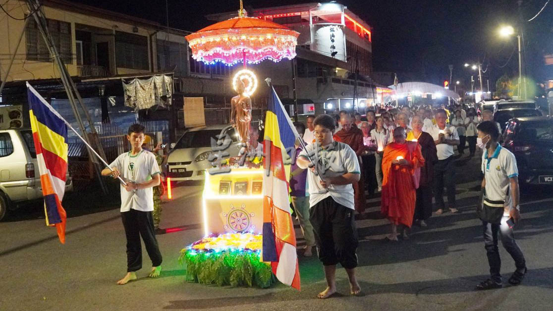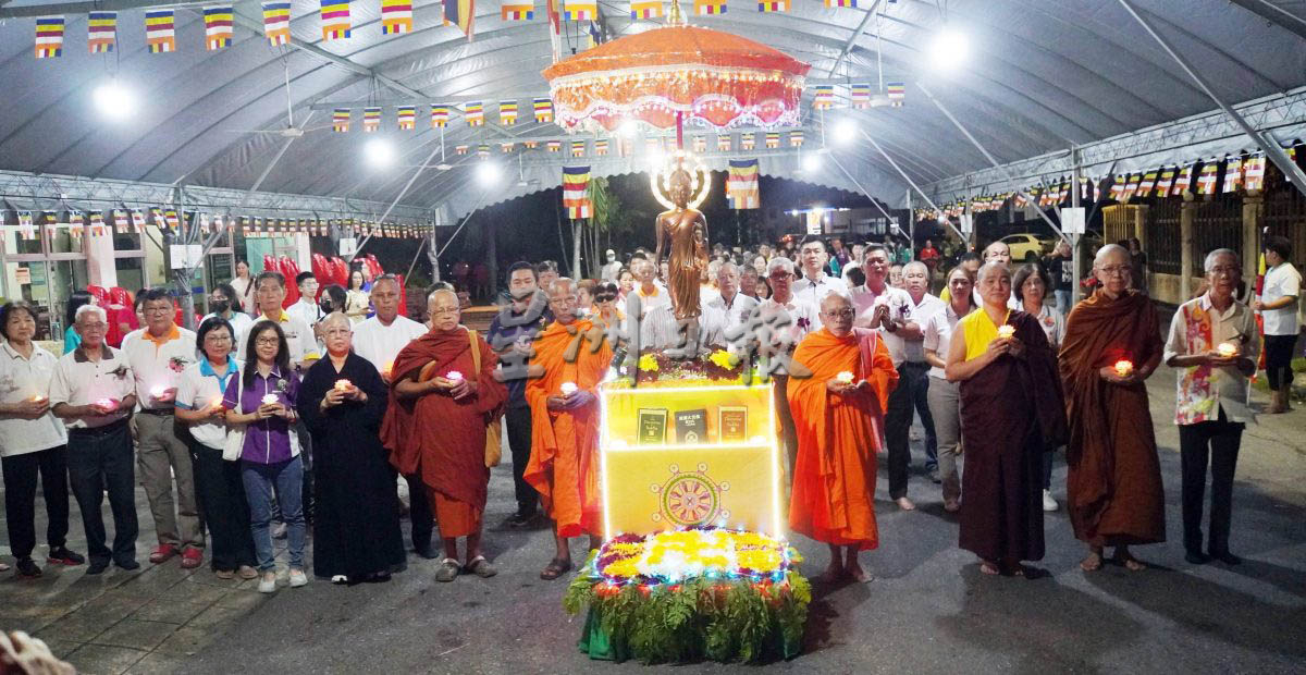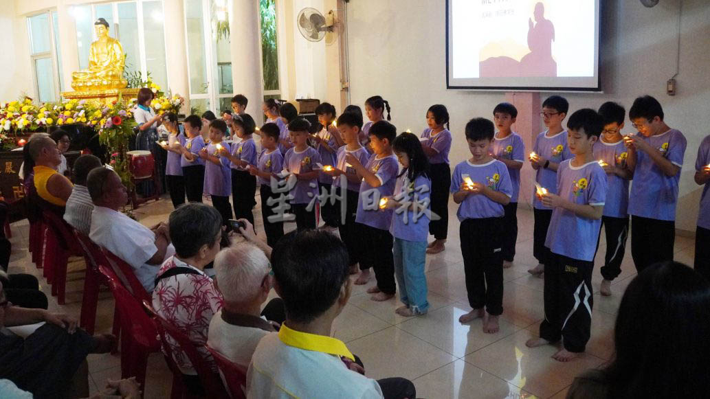该佛学会昨晚在大殿举行“卫塞节之夜”,安排幼儿园学生率领大众唱《三宝歌》,也安排周日佛学班学生演出《慈经》合唱,接着进行“正念行”,沿途播放佛号、诵念慈经,为大众散播慈爱心。