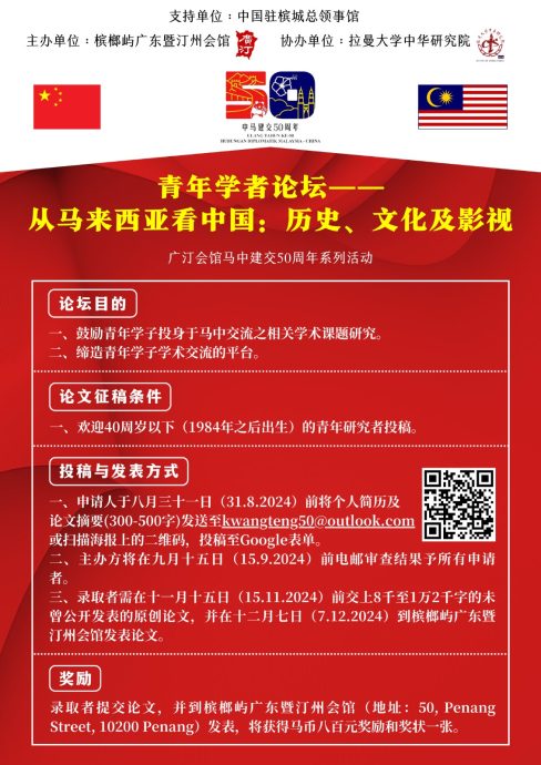 (槟城24日讯)为了庆祝马中建交50周年,槟榔屿广东暨汀州会馆在中国驻槟城总领事馆的支持下,举办“青年学者论坛——从马来西亚看中国:历史、文化及影视”。