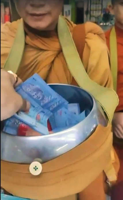他说,供养南传僧侣食物有一定的时间,僧侣过午不食,午后僧侣不会上街托钵,而化缘的托钵只可以放食物,绝对不能放现金。