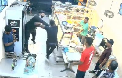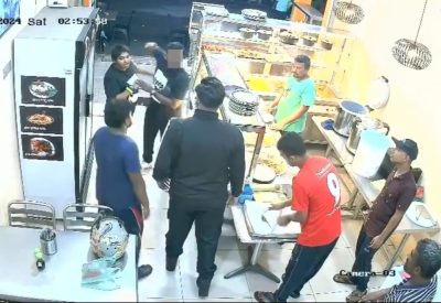 (槟城4日讯)2名男子在扁担饭餐厅起口角,双方开始互殴,壮男连续多拳击中对方脸部,将后者打趴在地。