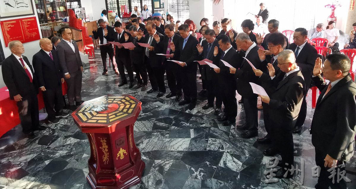 监誓人是巴东拉浪州议员兼槟州行政议员魏子森、世界德教联谊总会总会长李斯仁及署理总会长拿督陈钰标。