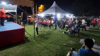 团结政府阵营昨晚在五公司花园草场举办团结讲座,讲座进行途中,一辆国盟的罗里流动讲台与一批支持者突然出现在会场外,一些孩童还高举国盟旗帜呐喊。
