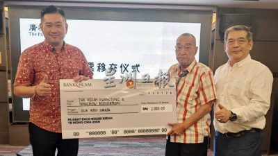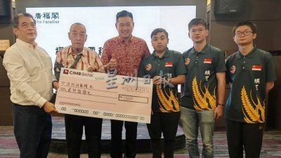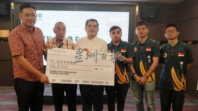 黄佳祯也移交2000令吉模拟支票给吉打广东暨汀州会馆作为“拿督张德仁杯”中国象棋公开赛活动基金。