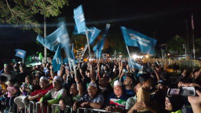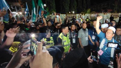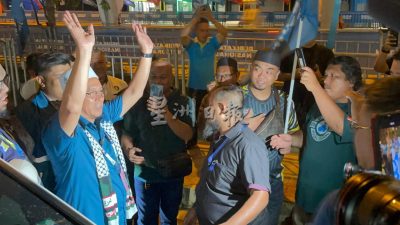 10.05pm: 国盟众领袖从总计票中心步出来,受到支持者喝釆迎接,中选的阿比丁也走到支持者前,首次以候任州议员身份发言。