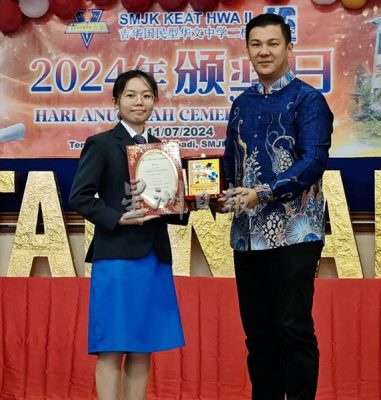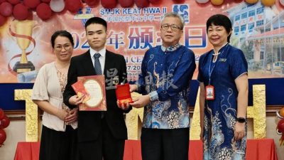 仪式上,蔡德兴也在校长廖雪萍陪同下,颁发“董事长金牌奖”给2023年大马教育文凭考试最优异学生黄副航,他获得一枚金牌和500令吉的奖励,由母亲谢丽云陪同领奖。