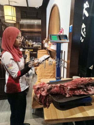 马来西亚纪录大全的职员在现场为所切割下来的鱼肉称重,最后确认这条鱼重达224公斤。(黄雨云摄)