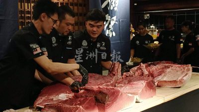 (槟城19日讯)槟城一家日本料理店配合夏季獭祭嘉年华举办“最重的切割表演”,3名日式料理师傅轮番合力在约1小时内将224公斤重的蓝鳍金枪鱼进行切割,展示精湛的刀工技艺和传统的料理技法,并荣膺“大全。